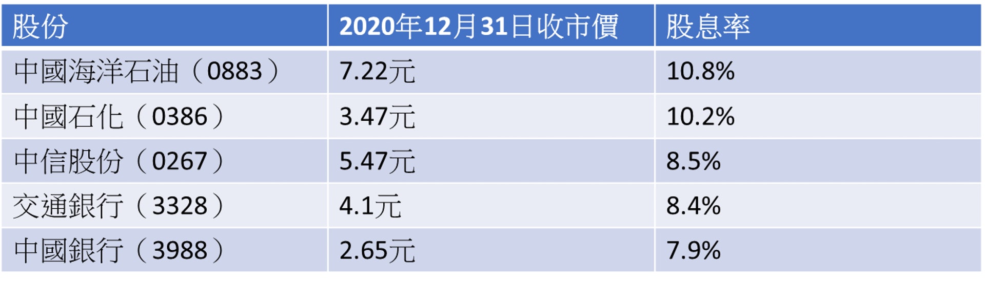 截至2020年12月31日,最高股息率的5隻成份股分別為中海油(0883)﹑中石化(0386)﹑交通銀行(3328)﹑中信股份(0267)及中行(3988)。可是中信﹑中海油為該年表現最失色藍籌股排名中的首2名,全年分別跌47.31%及44.6%,反映出相關股份息率高企的原因之一,與其股價出現較明顯跌幅有關。
