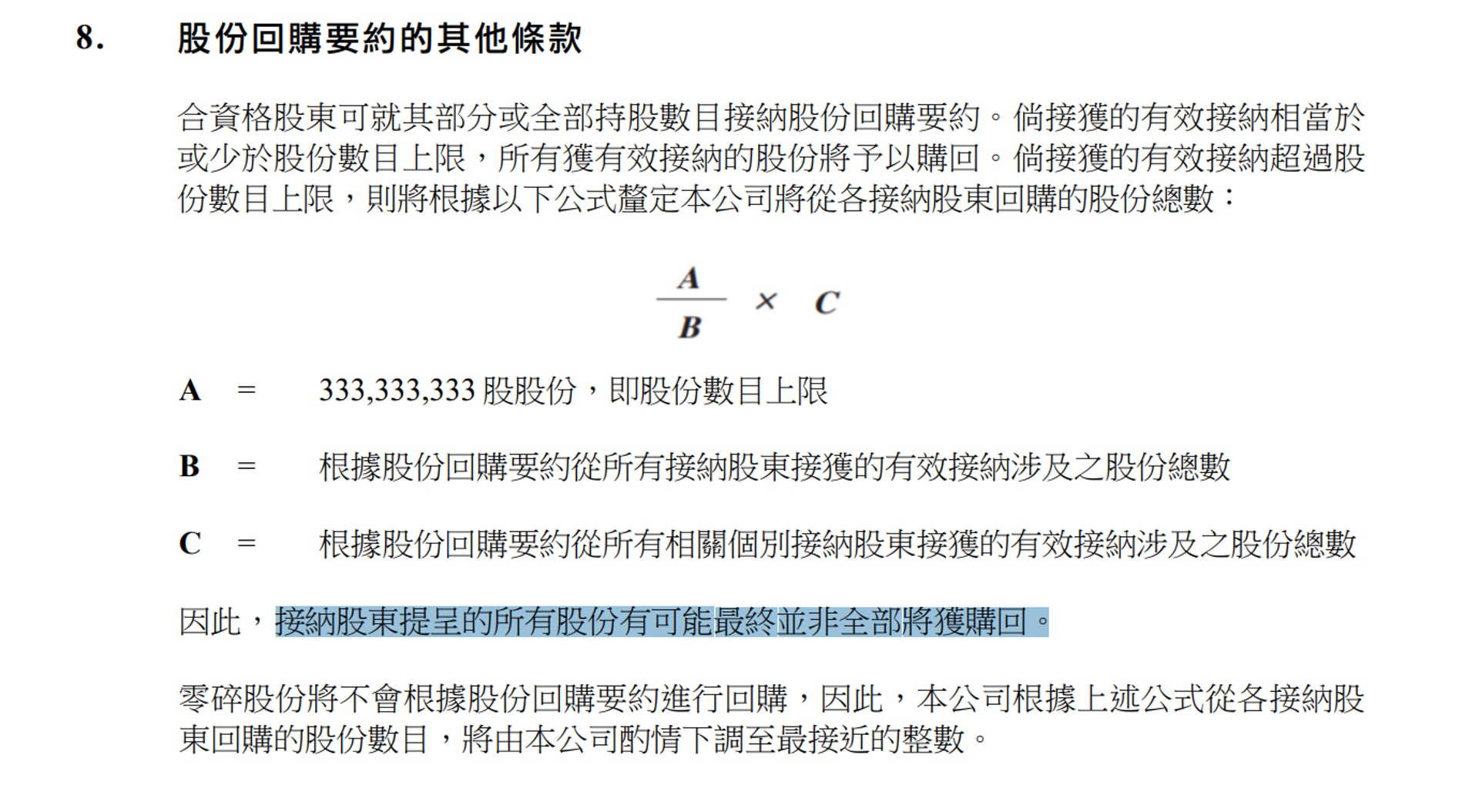 若現水位買入,交易獲股會特別大會通過後可以51元「沽返畀長實」,已有約3至4元的「潛在溢價」。惟要留意的是,若果太多人都用這種做法,長實已表明會用一條公式(見圖二),「抽出」回購的股份數目,換言之,股東所提呈的股份有可能不獲全數購回,亦有可能出現「碎股」等問題。