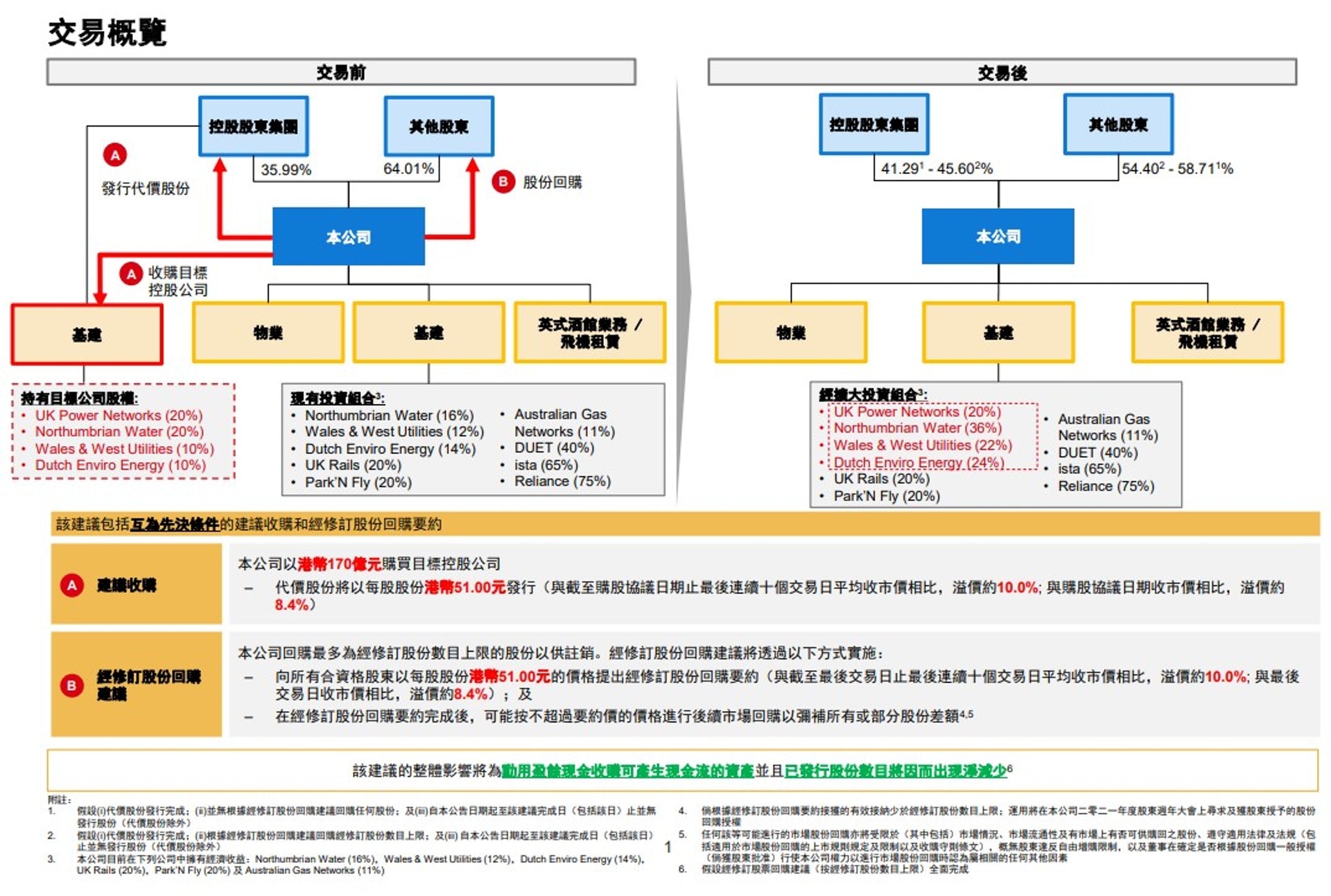 倘今次交易獲得通過,長實除首次買入UK Power Networks 20%股權投資外,更同時增持Northumbrian Water、Wales & West Utilities、Dutch Enviro Energy,持股分別升至36%、22%及24%。而大股東李嘉誠及李澤鉅於長實的持股將大幅升至45.6%。