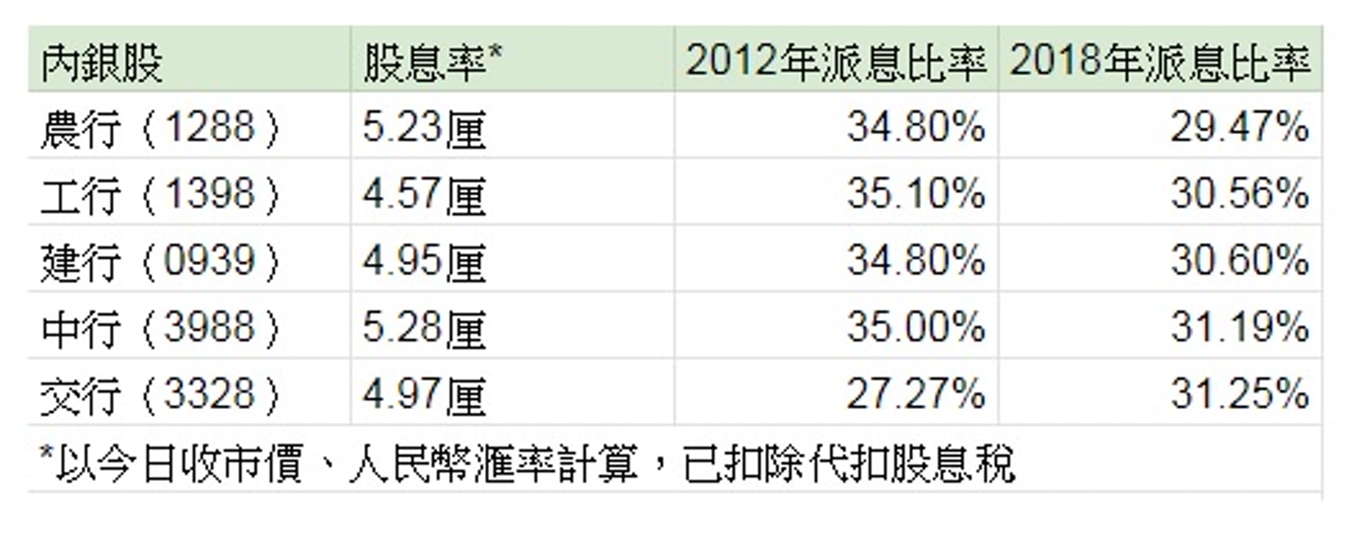 除了股息稅及匯率外,投資者亦要留意近年內銀股的派息比率每況愈下。所謂派息比率即是公司將盈利以股息派發予股東的比率。四大內銀的派息比率由2012年的約三成半水平,降至去年約三成。以中國銀行(3988)為例,2012年時其派息比率有35%,惟在2018年則降至31.19%、工商銀行(1398)則由35.1%降至30.61%,反映出內銀股不如以往「慷慨」。