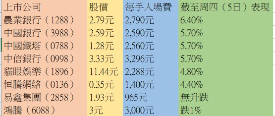 螞蟻當日以每股80元﹑每手50股招股,計及手續費等,投資者每認購1手,便需要約4040元。因此以大約每手4,000元作門檻,在三大指數中物色投資象。發現能符合此門檻者,分別為中國銀行(3988)﹑農業銀行(1288)﹑中信銀行(0998)﹑恒騰網絡(0136)﹑易鑫集團(2858)﹑鴻騰(6088)﹑貓眼娛樂(1896)及中國鐵塔(0788)。