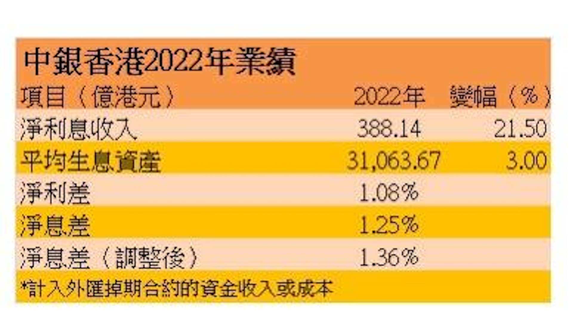 在長時間的高息環境下,銀行淨息差收入由去年下半年開始逐漸擴大,短期料繼續利好香港銀行業。中銀香港去年淨利息收入388.14億元,上升21.51%,抵銷淨息差擴闊19點子至1.25%,而計及外匯掉期合約資金收入或成本則升27點子至1.36%。